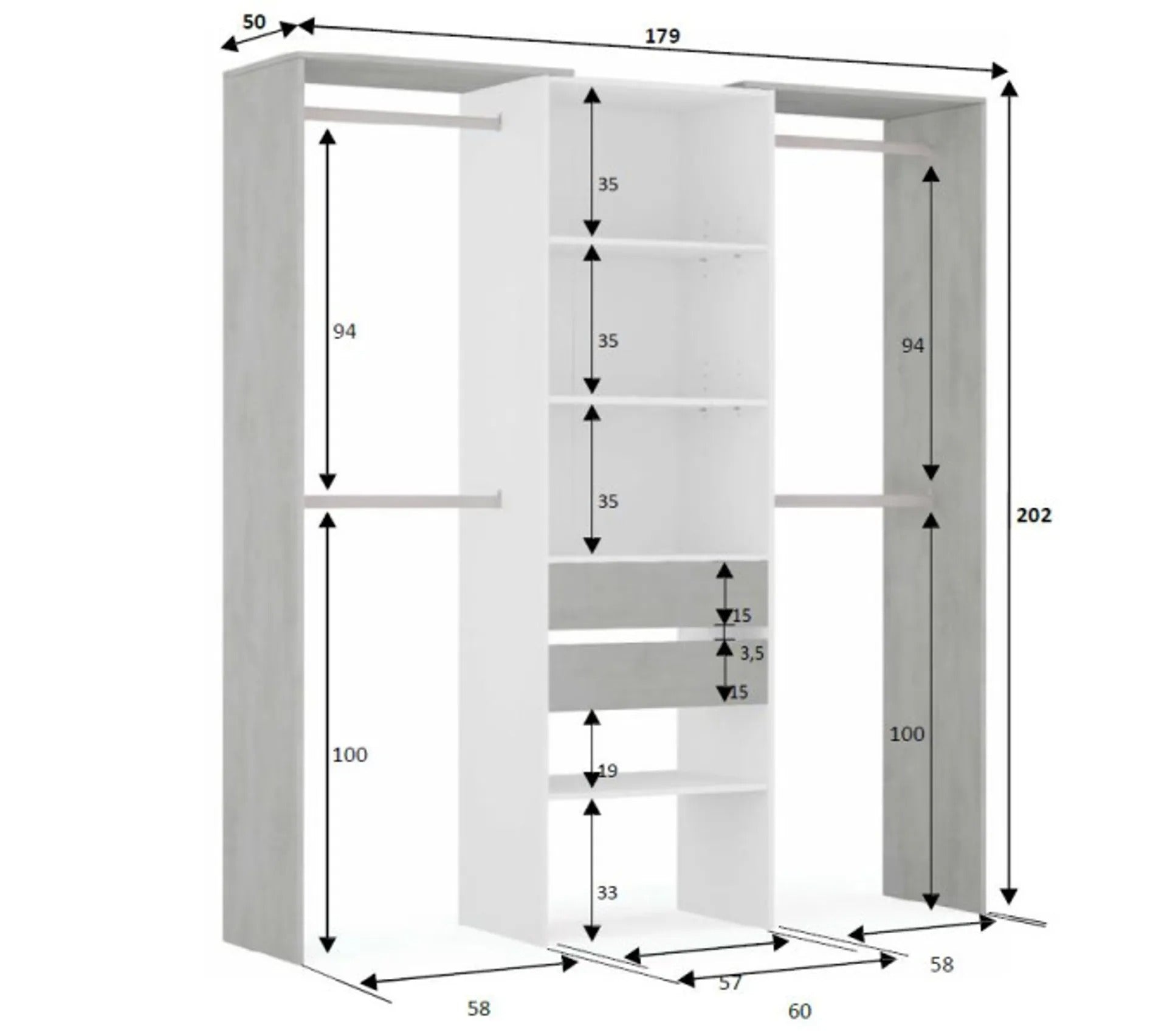 Aménagement dressing complet blanc et gris béton pour une chambre moderne dimensions: l 179 x l 50 x h 202 cm matière: panneau de particules mélaminé (épaisseur 15 mm) 4 barres de penderies, 4 niches et 2 tiroirs étagères réglables en hauteur : poids max supporté 8 kg troirs avec glissières métalliques : poids max supporté 5 kg butoirs abs antibruits et antirayures pour la partie inférieure du meuble assemblage: livré demonté - 75 kg - 2 colis fabrication: espagne