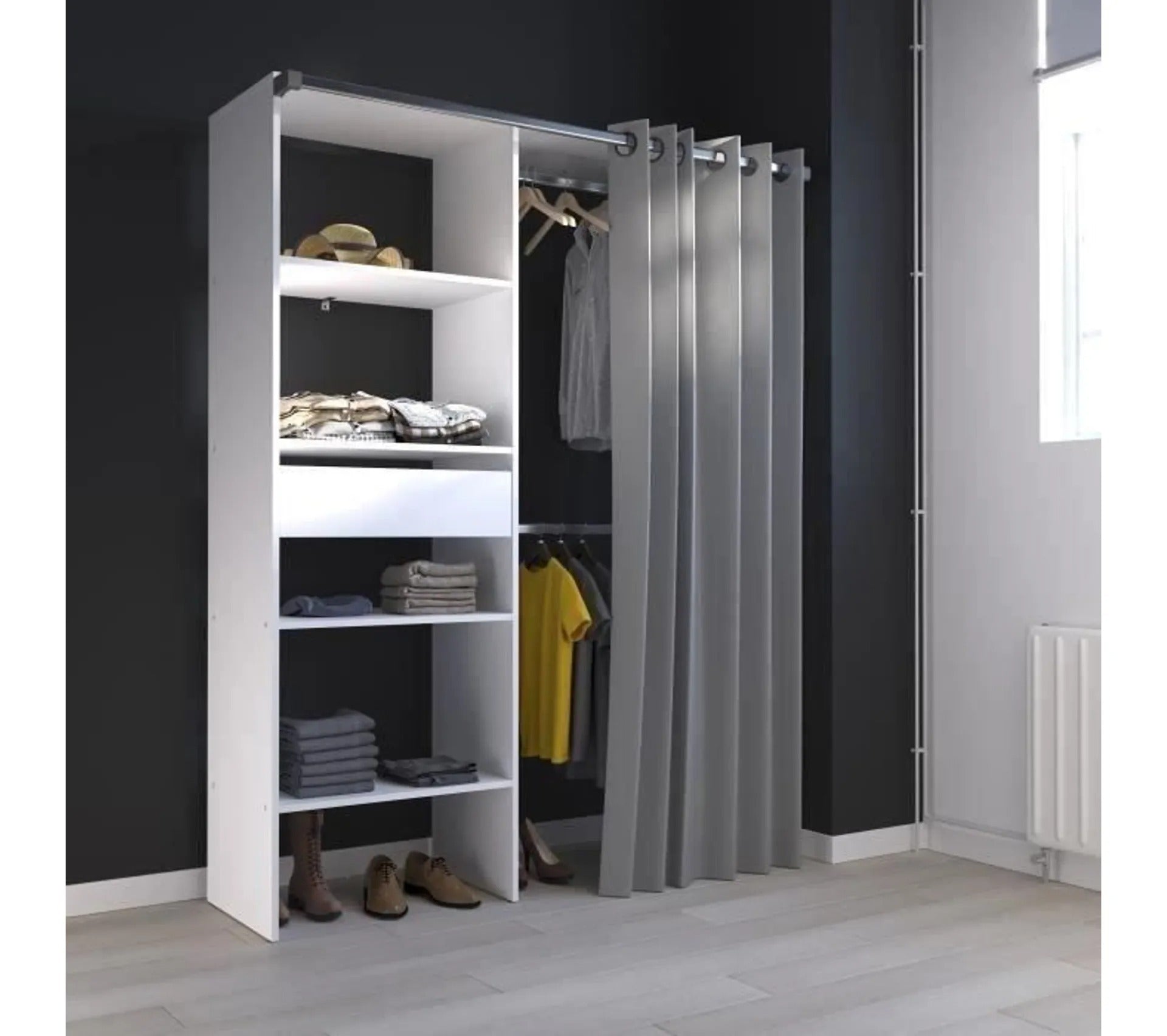 Ce dressing blanc s'accordera à tous les styles décoratifs, que votre chambre soit moderne, scandinave ou industrielle. Vous pourrez néanmoins ajouter le rideau de votre choix afin d'associer cet élément au reste de votre pièce. Solide, ce kit dressing est réalisé en panneaux de particules.
