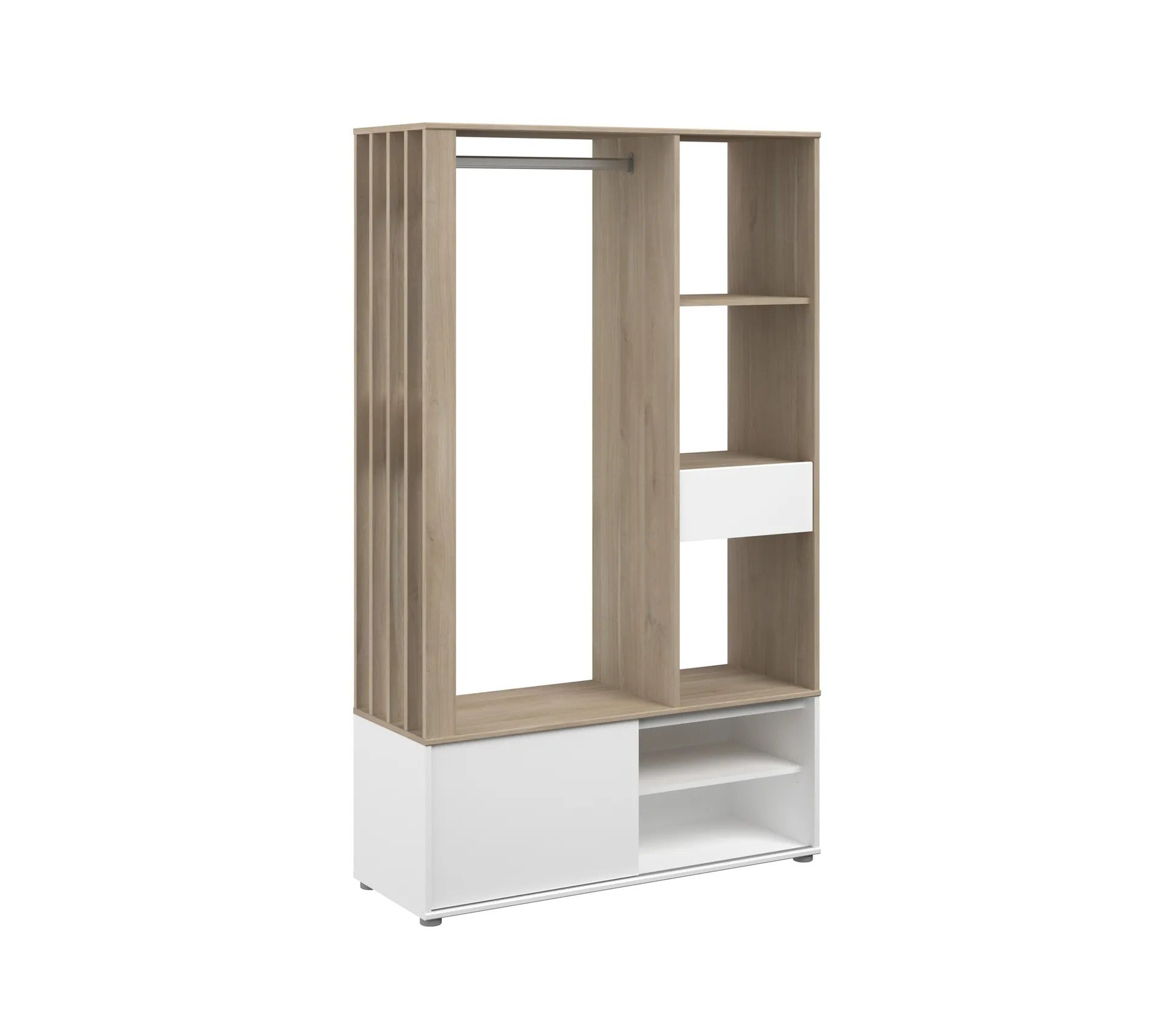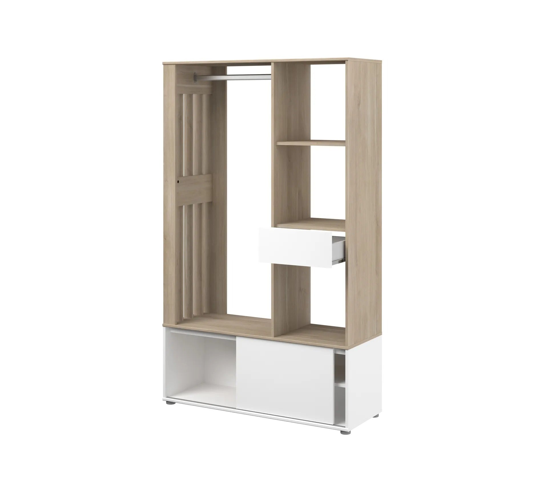 Structure Structure en panneaux de particules revêtus de papier décor imitation chêne et blanc. Montant "claustra" côté penderie en panneaux de fibres de moyenne densité.