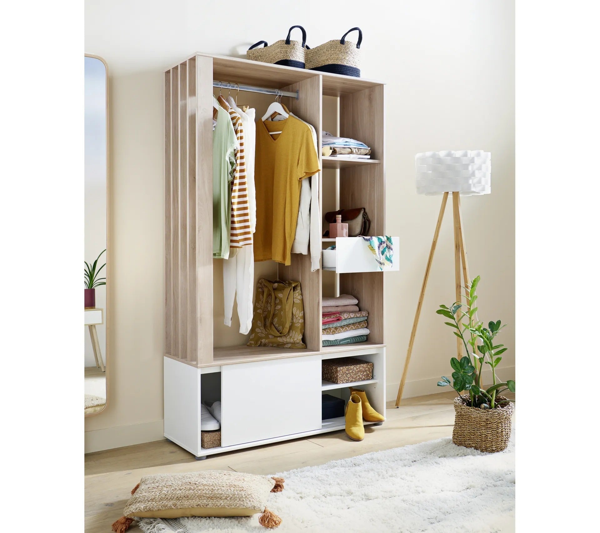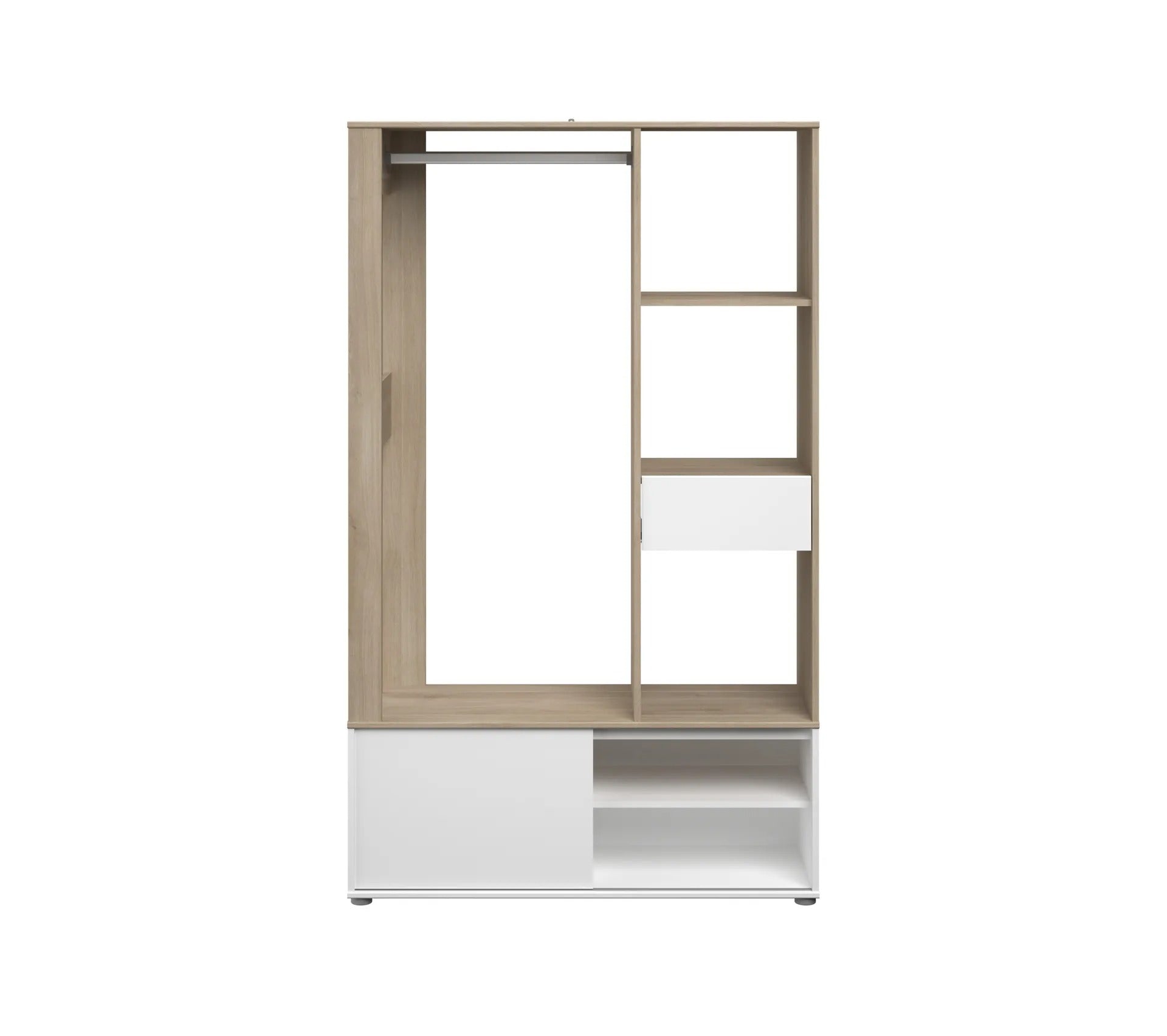 Ce kit dressing imitation chêne du Japon et blanc est résolument tendance. Il possède une structure robuste en panneaux de particules. Fabriqué en France, ce meuble vous accompagnera durant de nombreuses années. Il est soutenu par quatre pieds gris d'un diamètre de 5centimètres et d'une hauteur de 2 centimètres.