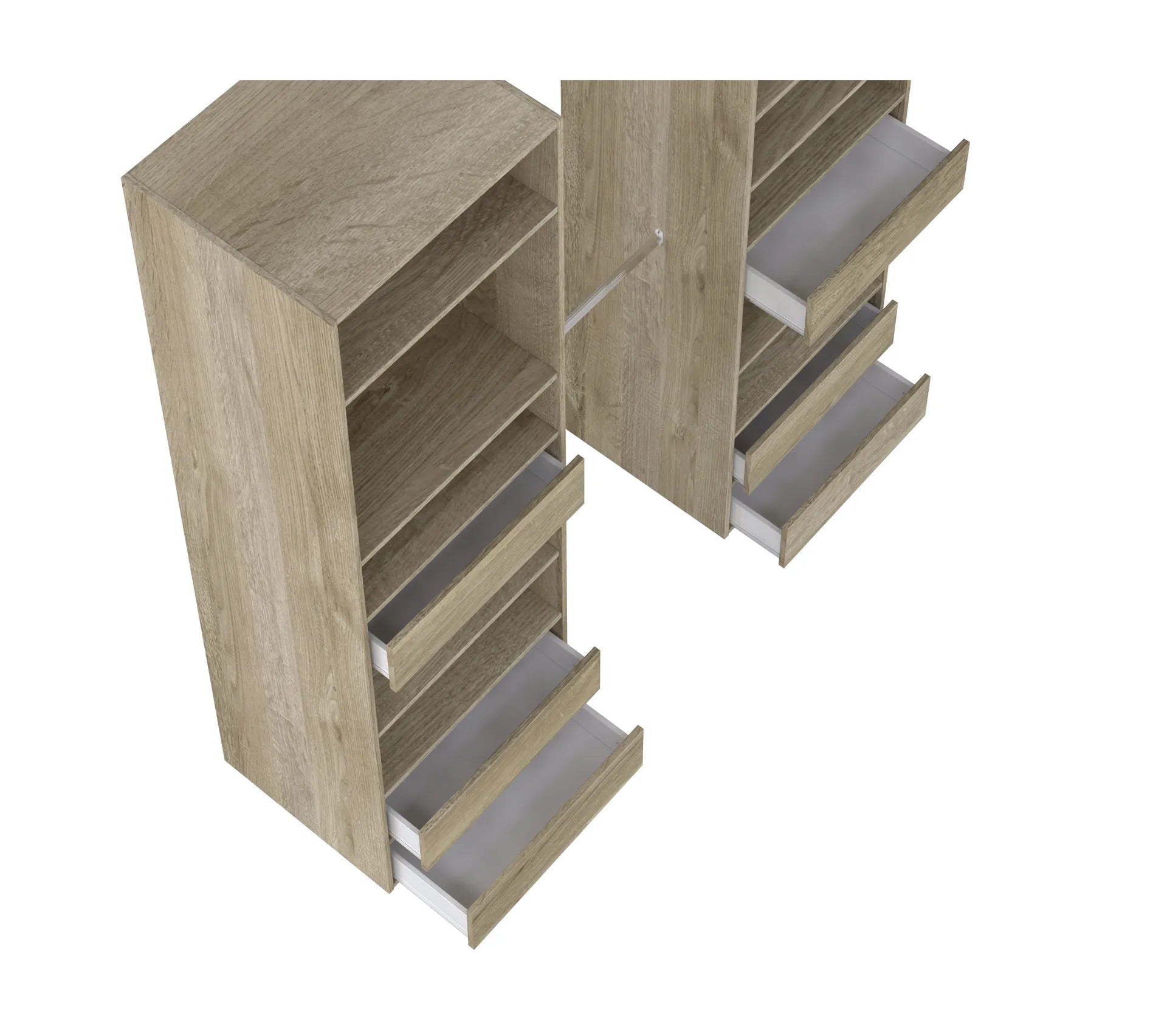 En conjuguant fonctionnalité et style, ce kit dressing imitation chêne apporte une vraie touche de modernité à votre chambre. On aime particulièrement la teinte chêne clair qui s'intègre facilement à tous les types de décoration, que votre pièce soit contemporaine ou plus classique.