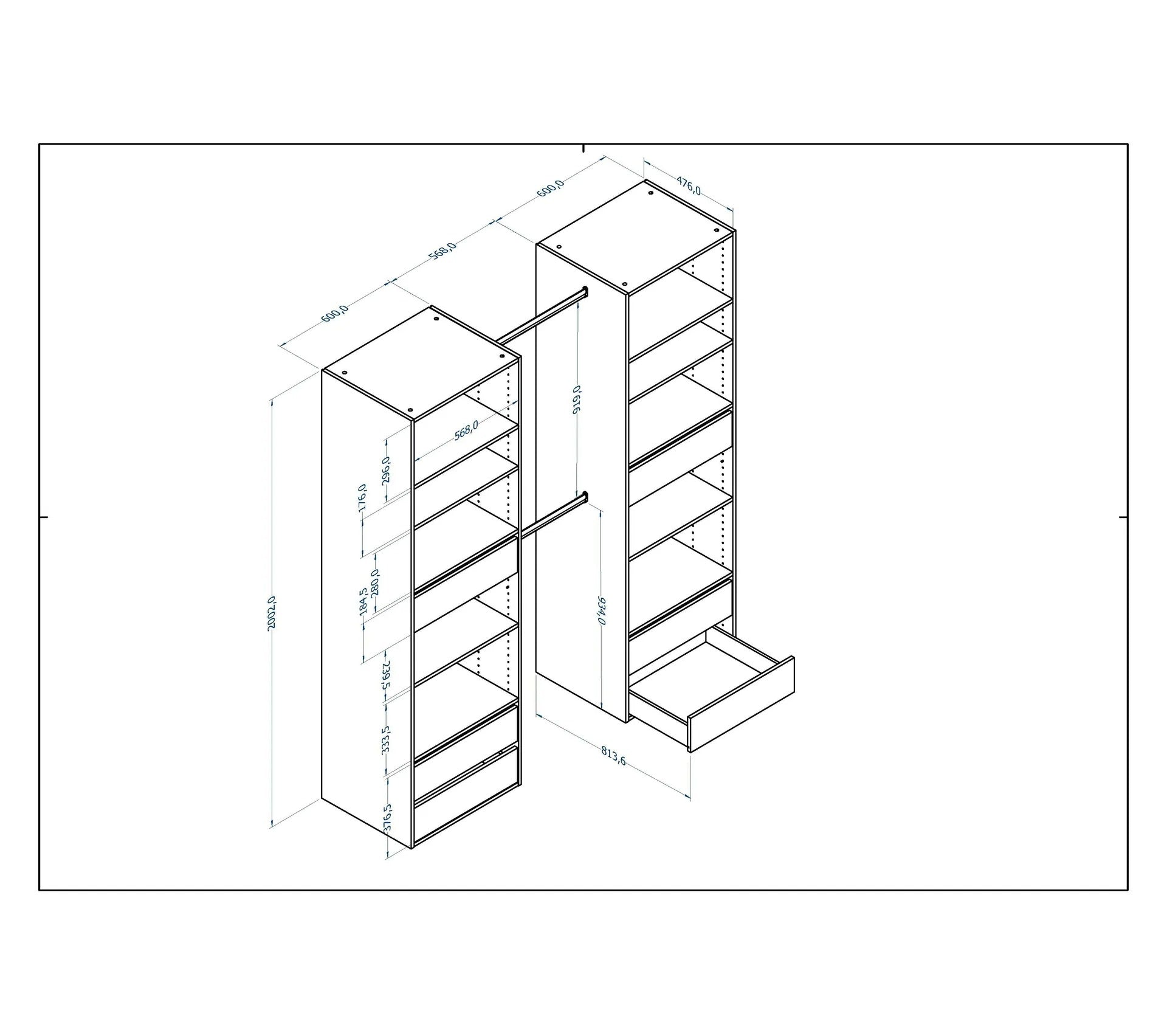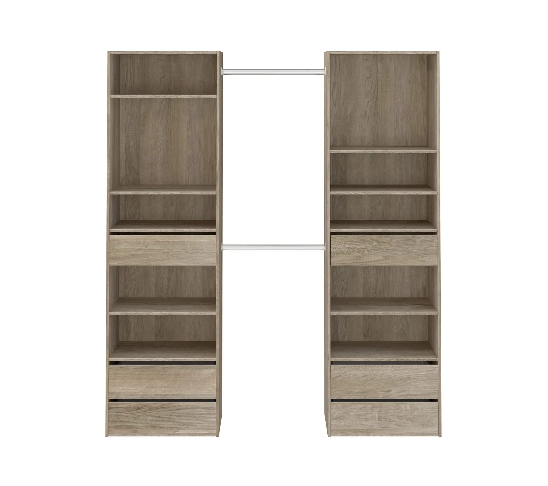 10 tablettes, 6 tiroirs et 2 barres de penderie.