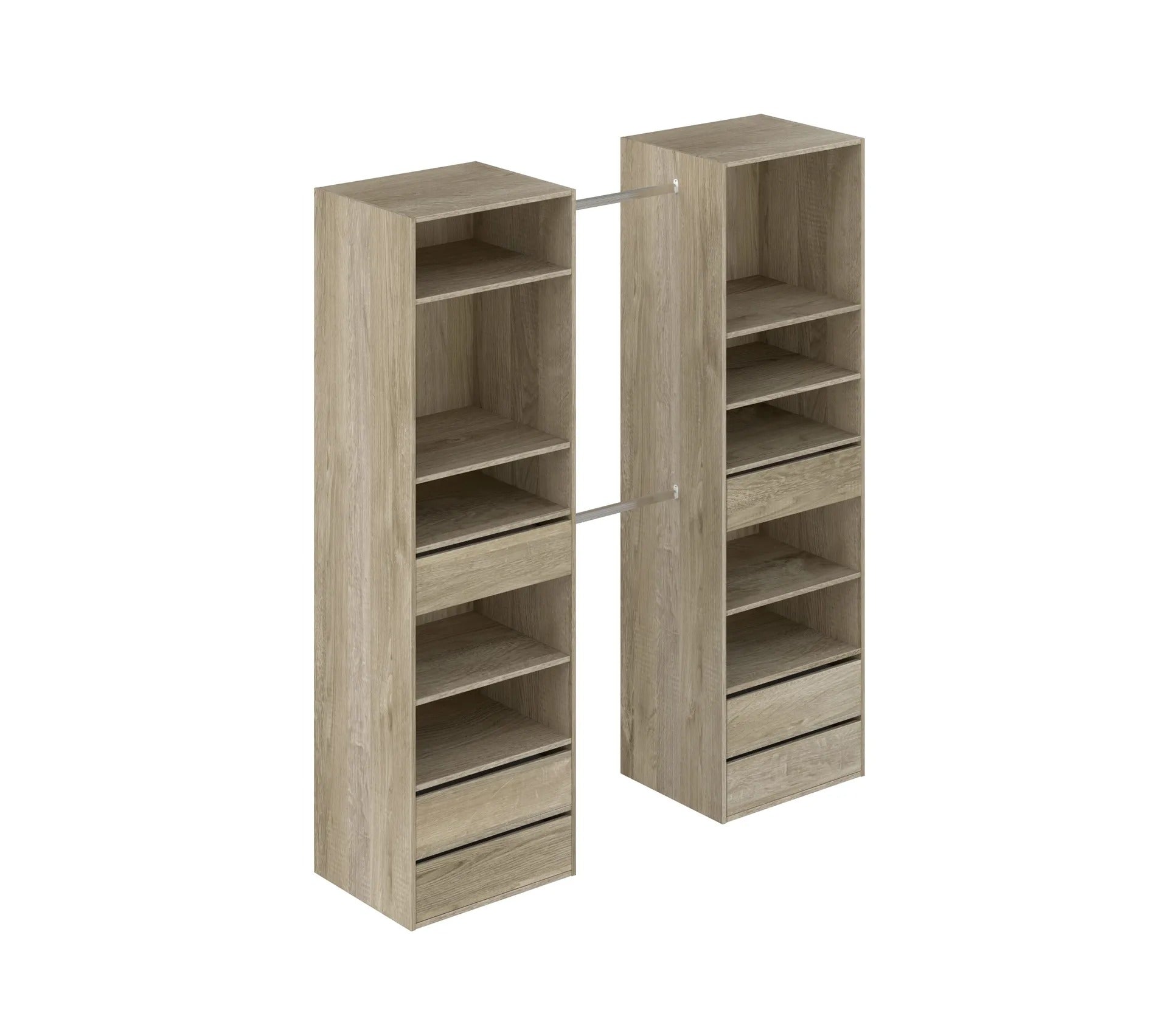 Structure composée de 2 colonnes avec chacune 5 tablettes et 3 tiroirs.