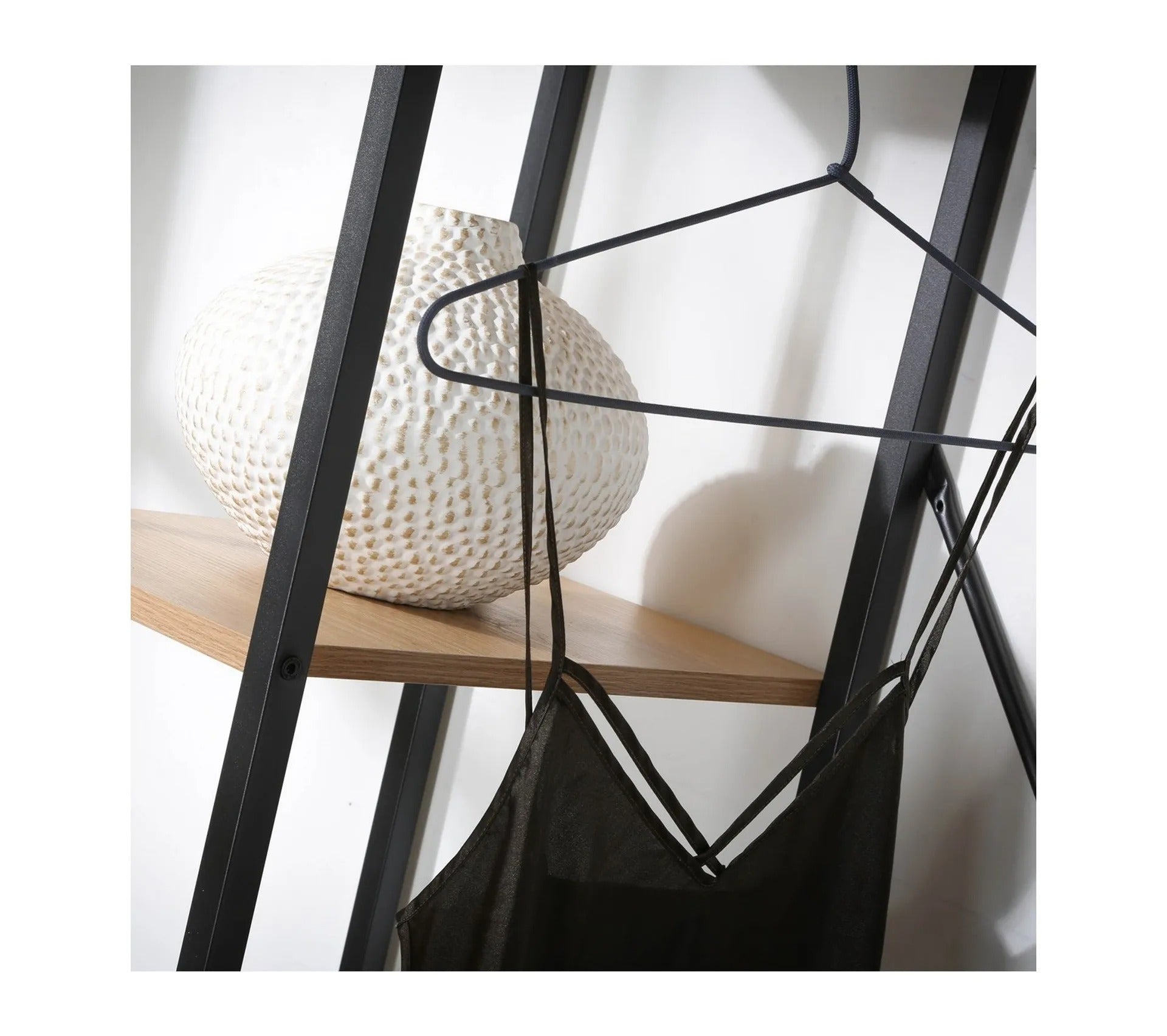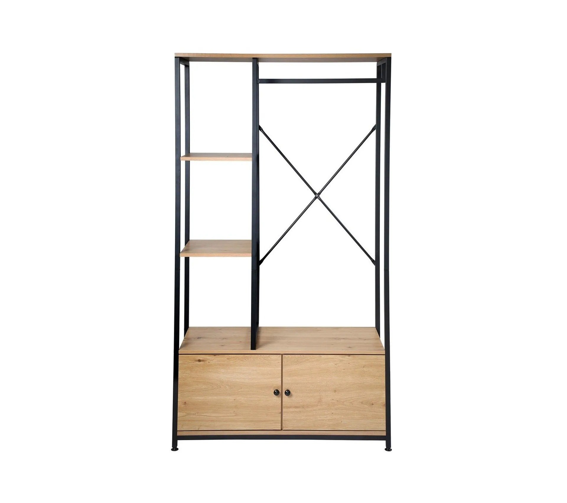 Caractéristiques produit :meuble penderie, 1 barre penderie, 1 tablette sur le dessus, 2 tablettes à gauche, 1 rangement fermé par 2 portes à la base, pieds ajustables. fabriqué en panneaux de particules mélaminés, double face, tubes en métal noir. dimensions produit : longueur 90 cm x largeur 40 cm x hauteur 167 cm - poids net : 25,30 kg. dimensions colis : colis n°1 : longueur 98,5 cm x hauteur 17,5 cm x profondeur 47 cm - poids brut : 26,80 kg.